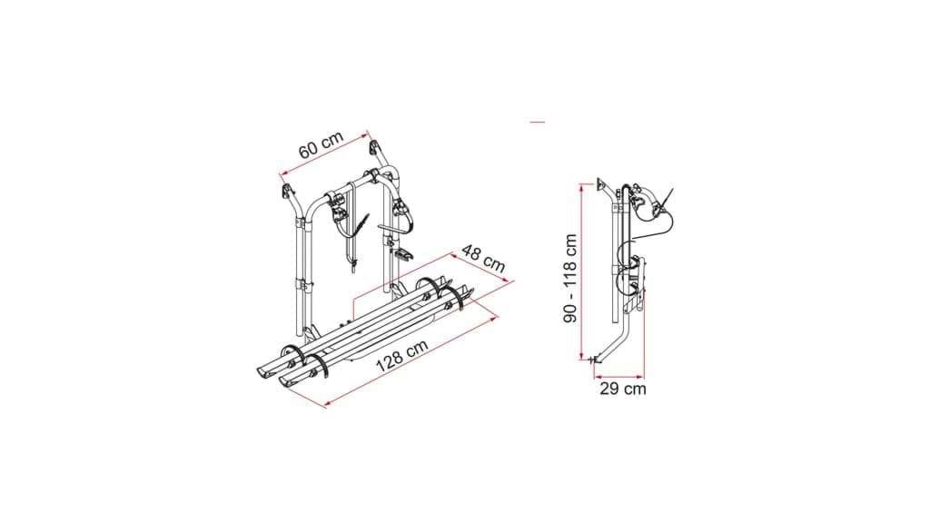 Fietsenrek geschikt voor montage op één van de achterdeuren. Passend op Fiat Ducato 1 en 2, Peugeot J5, Citroën C25, Ford Transit, Mercedes MB 100, VW LT, Citroën Jumper en Peugeot Boxer. Voorzien van twee Premium wielgoten. Inclusief Bike Block Pro 1 en 2. Maximaal draagvermogen 35 kg verdeeld over twee wielgoten.